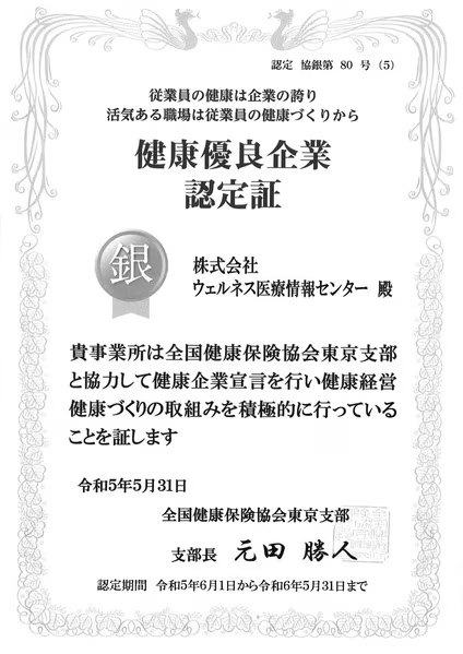 当社は、健康保険組合連合会東京連合会に「健康企業宣言」を行い、令和5年5月31日付で健康優良企業として「銀の認定」を取得いたしました。