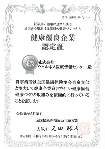 昨年当社は、健康保険組合連合会東京連合会にて「健康企業宣言」を行い、健康優良企業として「銀の認定」を取得しておりましたが、今年も継続して取得しております。